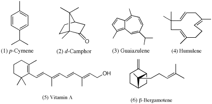 (c) 下記のテルペン系化合物のイソプレン単位を○で囲んで表示せよ(head-to-tailに注意)。